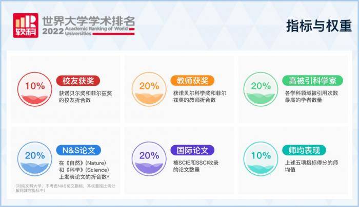 据介绍,软科世界大学学术排名的评价方法全部采用国际可比的客观指标和第三方数据,包括获诺贝尔奖和菲尔兹奖的校友和教师数、科睿唯安高被引科学家数、在《自然》(Nature)和《科学》(Science)上发表的论文数、被WebofScience科学引文索引(SCIE)和社会科学引文索引(SSCI)收录的论文数、师均学术表现等。