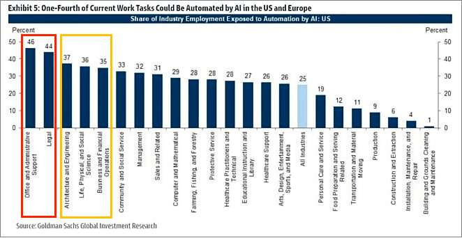 高盛集团于今年3月底发表的一份最新研究显示,随着AI技术对全球劳动力市场产生影响,预计多达3亿个工作岗位或将被AI取代。在欧美,办公室行政人员、法律工作者被替代风险最大,可被AI取代的工作比例超过40%;其后被替代风险较高的工作领域还有建筑与工程,生命、物理和社会科学,商务和财务运营等,可被AI取代的工作内容超过1/3。