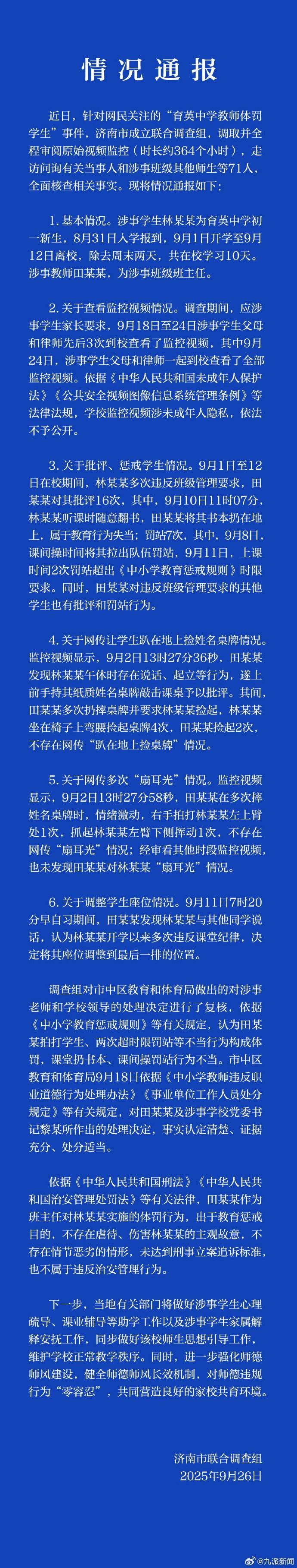 据微信公众号“济南时报”消息,9月26日,山东济南市联合调查组发布“育英中学教师体罚学生”调查结果的情况通报,全文如下: