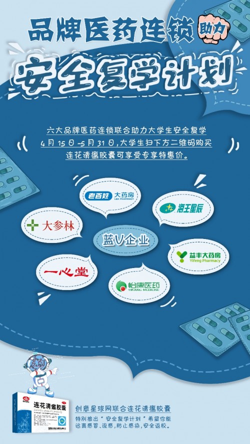 春暖花开日,学子归来时。连花清瘟胶囊联合创意星球网打造的“安全复学计划”公益行动受到了社会各界的关注和支持。全国知名医药连锁药店为返校复学的大学生提供专属优惠购活动,各省60余位高校教师呼吁学生做好复学防护准备,共同为全国大学生返校复学提供帮助,让同学们的复学之路更健康、更安心。当前,疫情尚未结束,安全复学计划将持续开展,呼吁全国大学生做好返校途中和复学后的防护措施,传递“关心自己,关爱他人”的健康理念,助力广大学子安全返校复学。