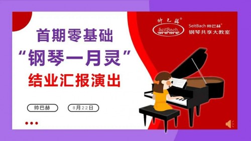 经过为期30天(4次大课)的钢琴手指灵活训练和学习后,帅巴赫(seitbach)首期零基础“钢琴一月灵”结业汇报演出于8月22日在佛山市百花广场隆重举行。本次汇报演共有15位不同年龄的“零基础”学员参与,其中年龄最大的现已69岁,而年龄最小的仅有4岁。据悉,本次汇报演出是以比赛的形式进行呈现,通过钢琴演奏旨在检查每位学员的训练成果以及手指灵活度。而评委团则是由文学家莎翁老师、德籍华人音乐教育家林一明老师、刘老师、黄老师共同组成。