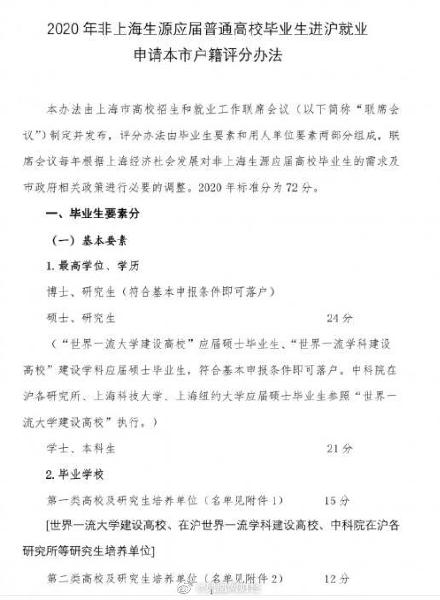 9月23日,《2020年非上海生源应届普通高校毕业生进沪就业申请本市户籍评分办法》正式发布。