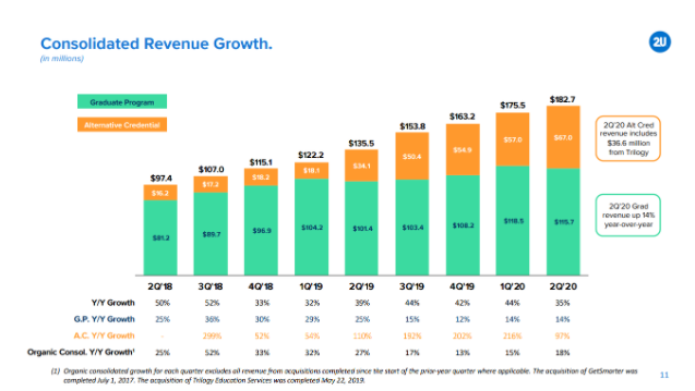 就2020年H1的业绩来说,2U(NASDAQ: TWOU)的表现给投资者打了一剂强心针,股价也随之逐渐涨回40多美元,虽然还远没有达到2018年5月98美元的峰值。