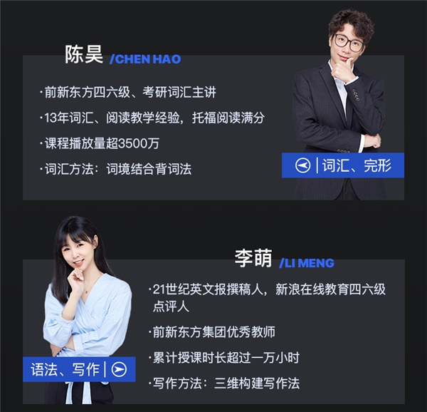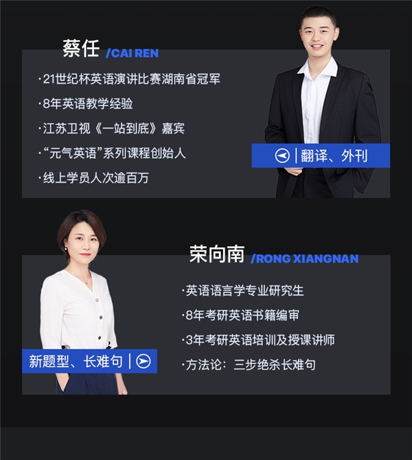 还有更多实力讲师,例如“考研阅卷组教师”、“《一站到底》嘉宾”、“8年考研英语书编审”等等神秘身份待你揭晓。专项实力讲师们不仅个人荣誉加身,能力超群,更是凭借着多年的教学实战经验,创立出独家解题方案,在教学界和学生圈都广受好评!