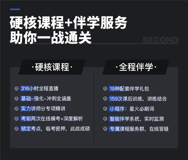 如果你担心直播课后遗忘?星火英语贴心包邮送全套考研资料,满足备考所需。更有诚意满满的伴学服务:专属课程群,课前提醒,课后监督,专业答疑。每一个备考过程中的问题,星火英语都认真对待,一丝不苟!