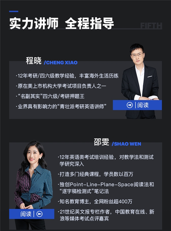 12年考研/四六级教学经验的,原在美上市机构考试项目负责人之一,“名副其实”考研押题王的程晓老师,实力可不容小觑。业界享誉“青壮派考研英语讲师”的指导下,你的阅读和写作还会犯愁?