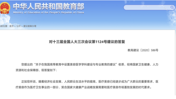 教育部在对十三届全国人大三次会议第1124号建议的答复中指出,随着经济社会发展,人民群众生活水平的提高,医疗美容已经逐步成为广大群众的重要需求,教育部大力支持美容医学学科建设和人才培养工作。