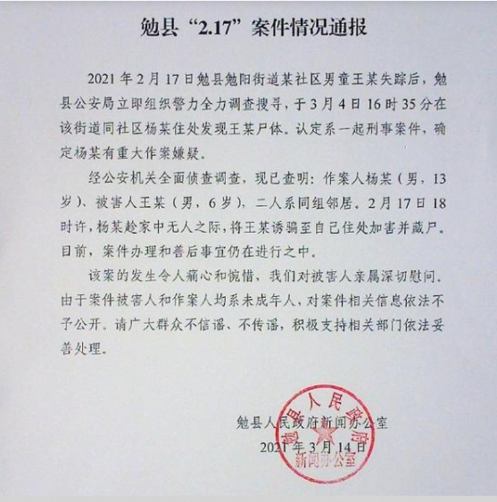 经公安机关全面侦查调查,现已查明:作案人杨某(男,13岁)、被害人王某(男、6岁),二人系同组邻居。2月17日18时许,杨某趁家中无人之际,将王某诱骗至自己住处加害并藏尸。目前,案件办理和善后事宜仍在进行之中。