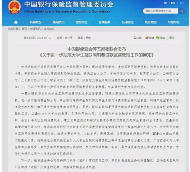 3月17日,中国银保监会等五部委联合发布《关于进一步规范大学生互联网消费贷款监督管理工作的通知》,进一步规范大学生互联网消费贷款监督管理,切实维护大学生合法权益。其中明确,小额贷款公司不得向大学生发放互联网消费贷款。