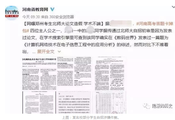 第四、自主招生是否已沦为自主腐败。这次答题卡事件在深挖过程中,网友顺藤摸瓜曝出高校自主招生过程中的大量灰色套路,如虚假论文、虚假专利、虚假奖项等。苏姓考生所在的某名牌中学批量制造了大量教授级、博士级论文成果,引起网络大量围观,一时传为笑谈。该校毕业生为捍卫母校“尊严”,发扬“五十步笑百步”的精神,检举出同城、同省、省外其他名牌中学的论文同样涉嫌作弊抄袭。“既然大家都在作弊,为何揪着俺们不放?”