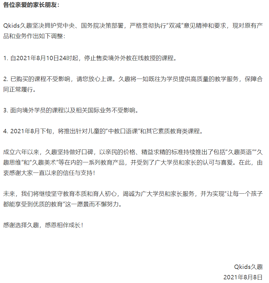 讯 8月8日,据久趣英语服务号消息,久趣英语将于8月10日停止售卖境外外教在线教授的课程,已购买的课程不受影响。