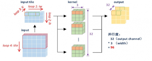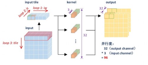 他们采用row-wise,weight stationary的方式重新设计卷积模块,并将乘法的并行度提高到96(3x32)使得网络可以同时计算32个卷积核的一行数据,以加快卷积的计算速度并提高片上数据的复用性。