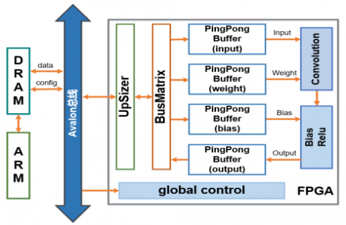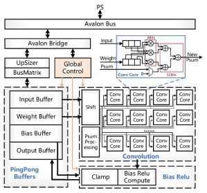 Data (数据)经UpSizer和BusMatrix进行仲裁,存储到相应的SRAM中,他们将PingPong Buffer取代原SRAM,用来实现数据传输和计算的并行;重新设计卷积模块,并将卷积结果直接传入BiasRelu单元,二者采用层融合的方式连接,以便提高数据读写和传输效率。