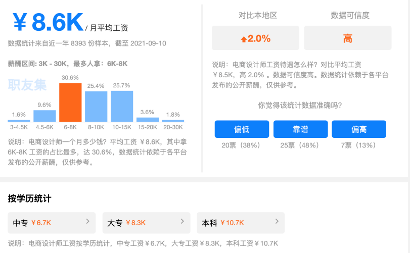 根据职友网的数据显示,职高(中专)毕业的电商设计师,在北上广这样的大城市,平均起步月薪接近7千,远高于同等学力其它专业。随着学历的提升,薪资涨幅也较大。