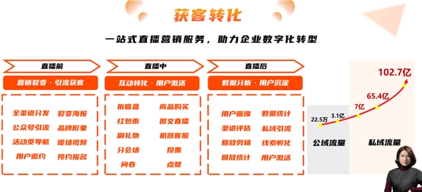 直播中:通过拆盲盒、红包雨、图文直播、刷礼物、投票、问卷点赞等多种互动,提高用户参与度;同时,全媒体分发将媒体流量引流到直播间,公域流量转化为私域流量,促进用户转化。