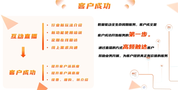 客户成功是一种长期的、科学的、专业化的战略,可以将客户和公司的可持续收益最大化。通过直播的方式高频触达客户,帮助业务的开展,为客户提供真正有价值的服务。