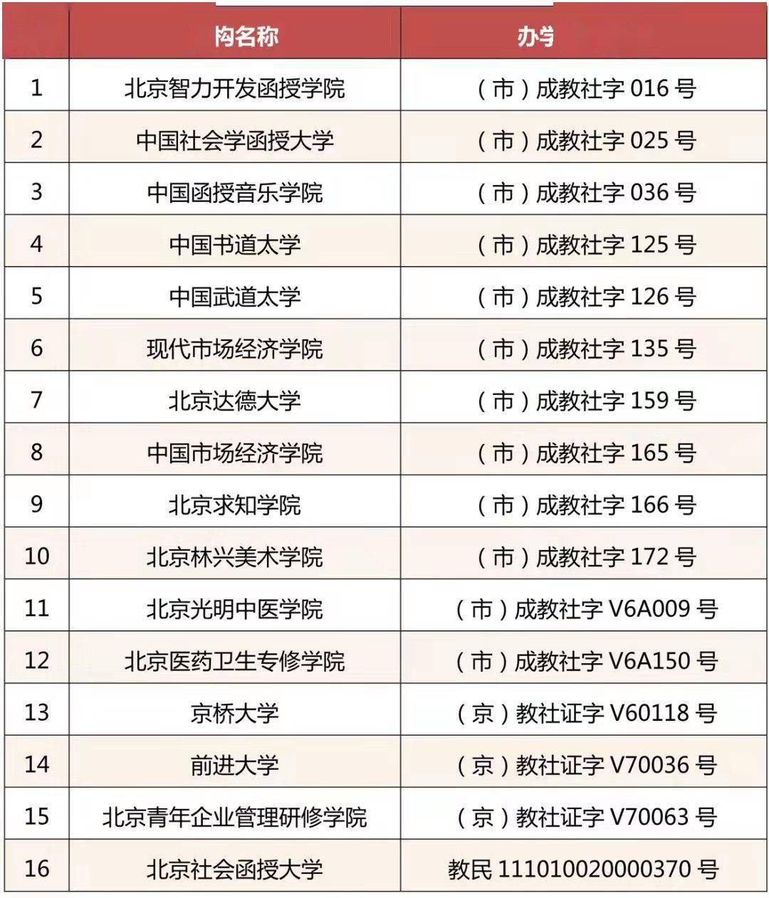 同时,北京智力开发函授学院、中国社会学函授大学、中国函授音乐学院等16所民办学校办学许可证到期后未依法予以延续。北京市教委表示,根据有关规定,该16所民办学校办学许可证自公告之日起废止并注销。
