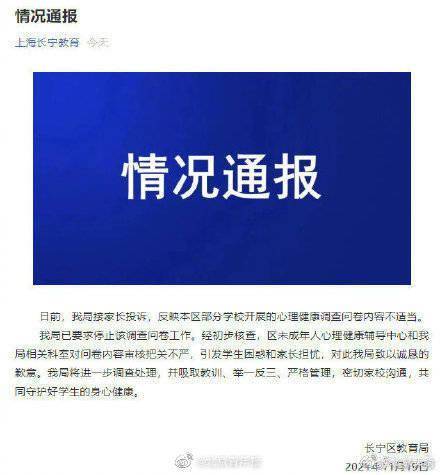 上海长宁区教育局11月19日通报:日前,我局接家长投诉,反映本区部分学校开展的心理健康调查问卷内容不适当。我局已要求停止该调查问卷工作。经初步核查,区未成年人心理健康辅导中心和我局相关科室对问卷内容审核把关不严,引发学生困惑和家长担忧,对此我局致以诚恳的歉意。我局将进一步调查处理,并吸取教训、举一反三、严格管理,密切家校沟通,共同守护好学生的身心健康。