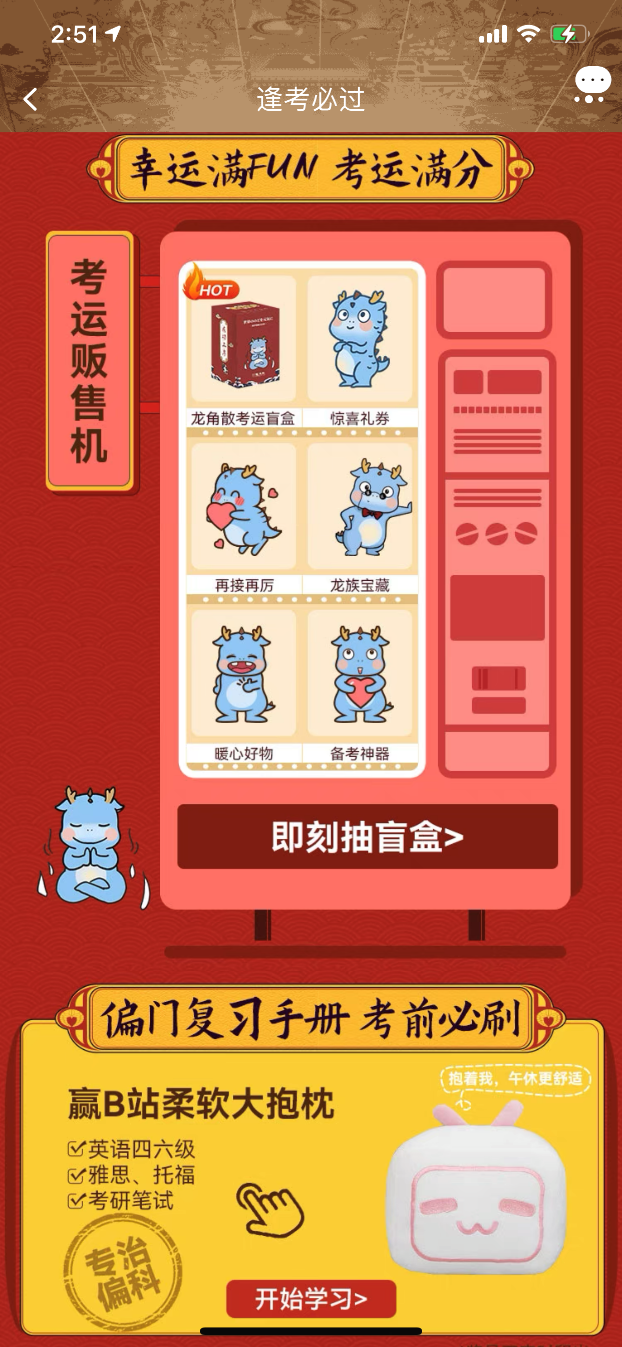 岁末年初,四六级、考研、公考等重磅考试纷至沓来。在密集背书备考的冲刺期,有着“背书神器”之称的日本百年护嗓品牌龙角散联合知名在线教育平台网易有道发起了面向考生的“逢考必过”主题活动,即日起考生登录有道词典APP活动主题页,即可在线学习精品冲刺课程,并有机会抽取价值500元+的“逢考必过”福袋。此外,龙角散还在线上线下多渠道推出了“考运贩售机”活动,免费派赠龙角散“考运”盲盒,受到考生们的关注和欢迎。