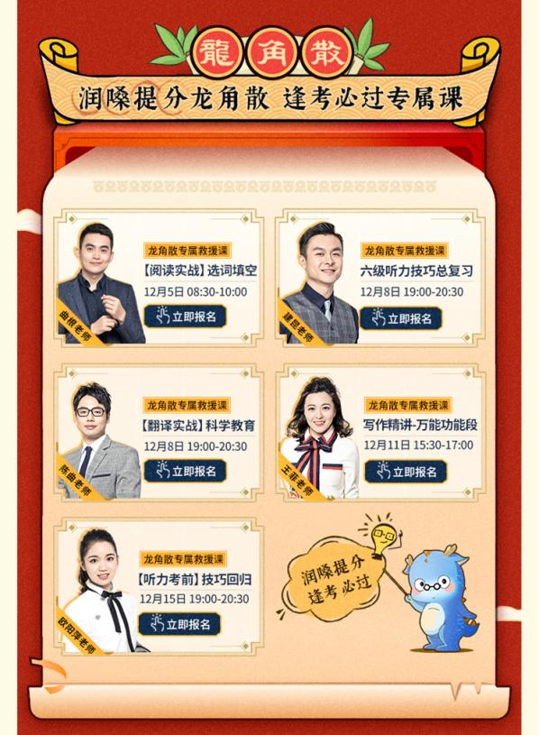 即日起至12月下旬,考生们登录有道词典APP,进入“逢考必过·龙角散”专题页,即可学习系列备考冲刺课程;分享备考感言或心得,还有机会抽取免费福袋、背书神器龙角散草本无糖润喉片等多重好礼。