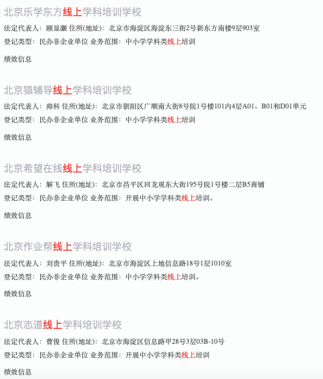 芥末堆文 据中国社会组织政务服务平台,12月3日,北京共有5家线上学科培训学校登记为民办非企业单位,业务范围均为开展中小学学科类线上培训,分别为北京作业帮线上学科培训学校、北京猿辅导线上学科培训学校、北京希望在线线上学科培训学校、北京志道线上学科培训学校、北京乐学东方线上学科培训学校。