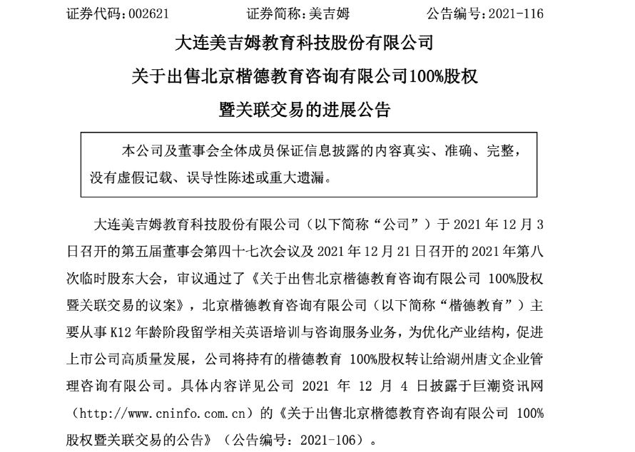 2021年12月3日,美吉姆召开第五届董事会第四十七次会议及 2021 年 12 月 21 日召开的 2021 年第八次临时股东大会,审议通过了《关于出售北京楷德教育咨询有限公司 100%股权暨关联交易的议案》。