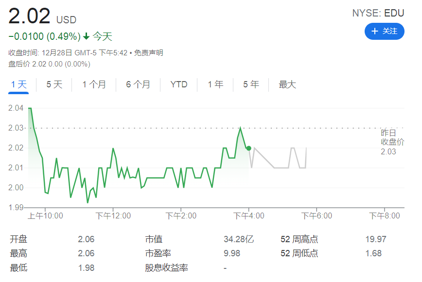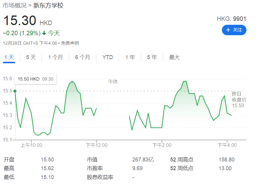 截止12月28日,新东方美股收报2.02美元,年初至今下跌88.39%;港股收报15.3港元,年初至今下跌89.32%。