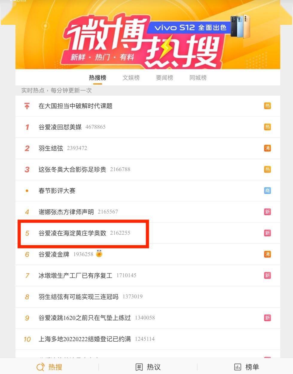 随后,“谷爱凌在海淀黄庄学奥数”这一话题登上社交媒体热搜。