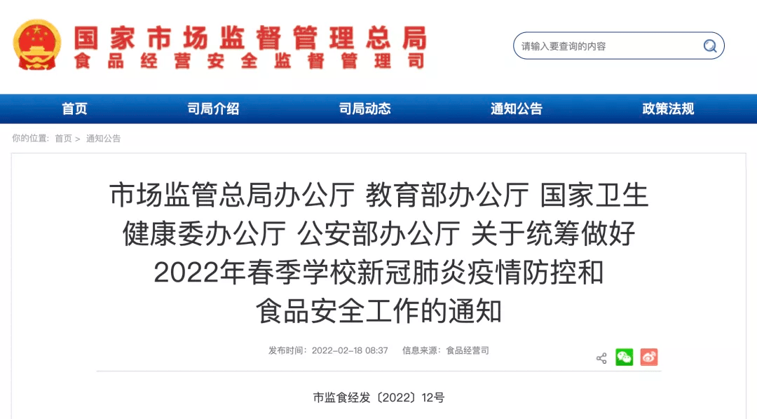 为统筹做好学校和幼儿园(以下统称学校)常态化疫情防控和2022年春季学期学校食品安全工作,2月18日,市场监管总局办公厅联合教育部办公厅、国家卫生健康委办公厅、公安部办公厅印发《关于统筹做好2022年春季学校新冠肺炎疫情防控和食品安全工作的通知》(以下简称《通知》)。