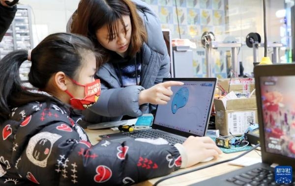 辅导老师冯怿纯(后)在指导学生通过3D打印建模制作调色板。