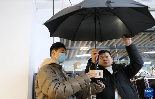 宋元坤(左)和辅导老师一起调试他制作的带照明和发送呼救信息功能的雨伞