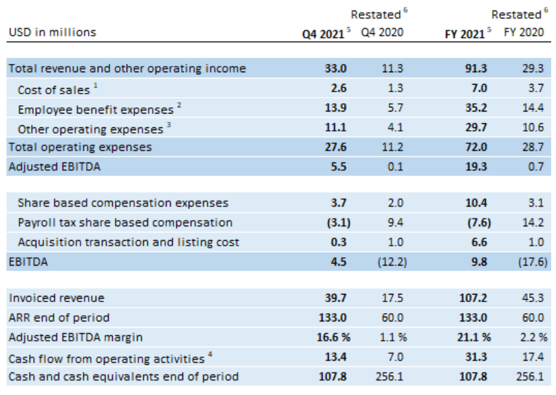第四季度,Kahoot!的开票收入(invoiced revenue或billings)为3970万美元,同比增长126%。总收入和其他营业收入为3300万美元,同比增长193%。第四季度调整后的息税折旧摊销前利润(不包括股份补偿费用和相关工资税、收购相关费用和上市成本)为550万美元。运营产生的现金流(不包括上市和收购成本的支付,以及与基于股份的薪酬相关的现金影响)为1340万美元,同比增长92%。