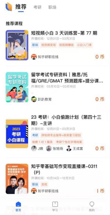 芥末堆发现,知学堂目前上线的课程涉及考研、留学、职场提升等领域。其中职场提升课程由“知乎研职在线”提供;留学课程由在线留学考试培训机构“趴趴教育”提供;考研方面则延续其此前产品,推出《23考研小白偷跑计划》。