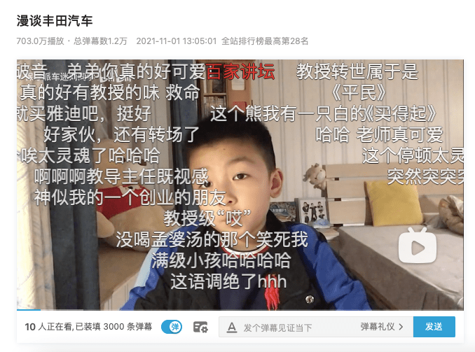 在两则观看量达700万的视频中,分享的主题分别为《漫谈丰田汽车》与《聊聊英国历史及英国资产阶级革命》。前者出自一位小学生博主“保守派车迷刘同学”,后者则是一位八年级的中学生博主“黄埔之星”。