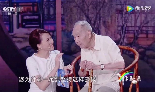 在一档综艺节目中,董卿为了照顾轮椅上 96 岁高龄的嘉宾,许渊冲老先生,她很自然的选择了跪地采访。