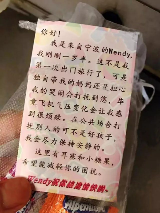 " 我刚刚一岁半……独自带我的妈妈担心我的哭闹会打扰到您,这里有耳塞和小糖果,希望能减轻你的困扰…… "