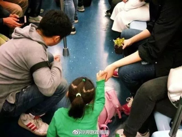 直到地铁到站前,这位妈妈一直保持着这个动作。