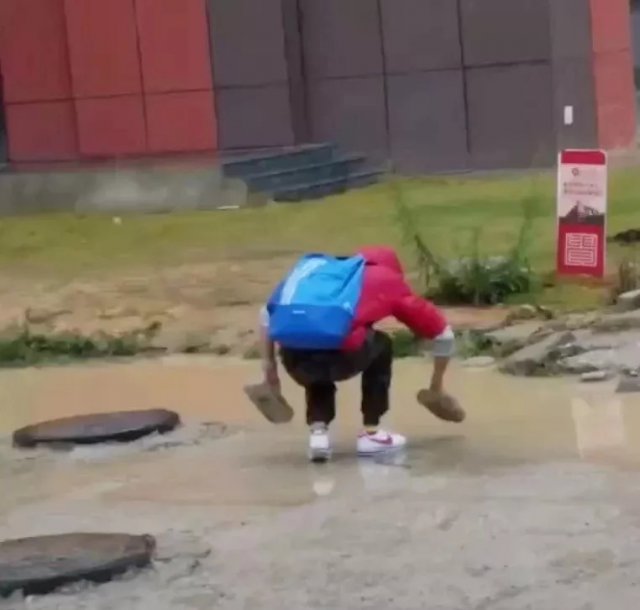 暴雨过后,一个背书包的男孩,在一段满是积水的路上停了下来。