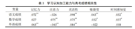 对学习认知加工能力的记忆力、注意力、灵活性、敏捷度、时间感知觉,和高考的语文、数学、外语三科成绩进行相关性分析;