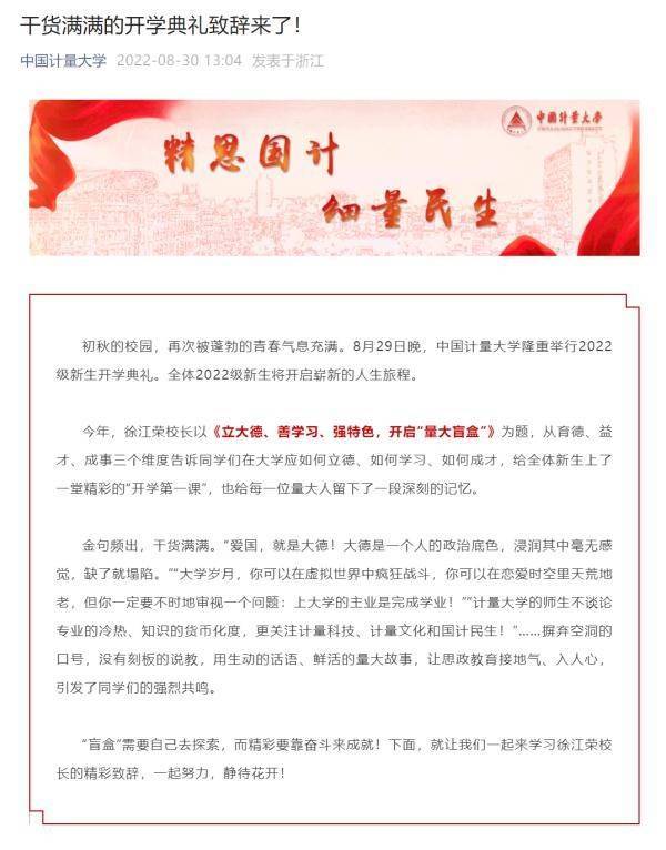 随后,学校微信公号发布消息称,校长徐江荣以《立大德、善学习、强特色,开启“量大盲盒”》为题,给全体新生上了一堂精彩的“开学第一课”,也给每一位量大人留下了一段深刻的记忆。