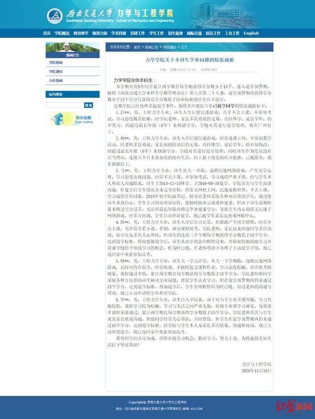 据红星新闻报道,2020年11月10日,西南交通大学力学与工程学院网站发布了一则通报。