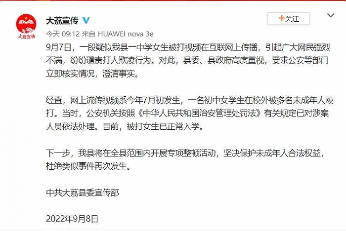 中共大荔县委宣传部9月8日发布通报称:经查,网上流传视频系今年7月初发生,一名初中女学生在校外被多名未成年人殴打。当时,公安机关按照《中华人民共和国治安管理处罚法》有关规定已对涉案人员依法处理。目前,被打女生已正常入学。