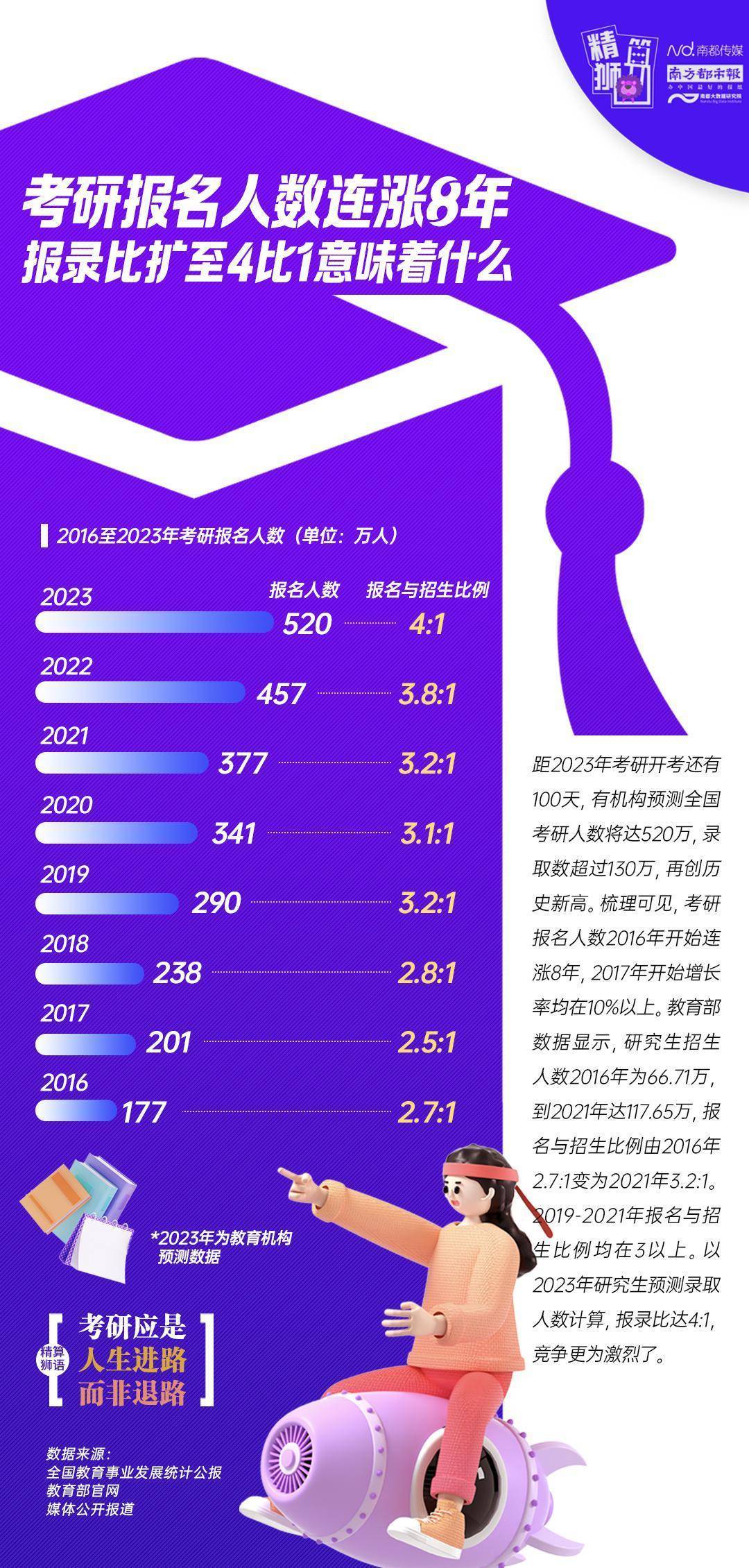 摘要: 原标题:明年报录比或达4:1 8年数据带你看考研趋势 距2023年考研开考还有100天话题冲上微博热搜。有教育机构预测2023年全国考研人数将达520万,录取人数