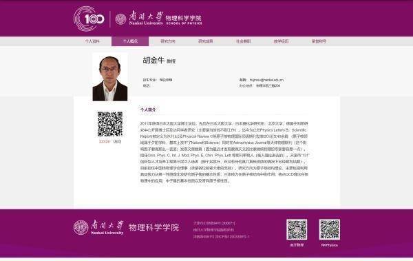 潇湘晨报记者注意到,目前进入南开大学物理科学学院官网查询胡金牛的简历,尚未查到,扫码教授信息,也显示个人资料网页无效。
