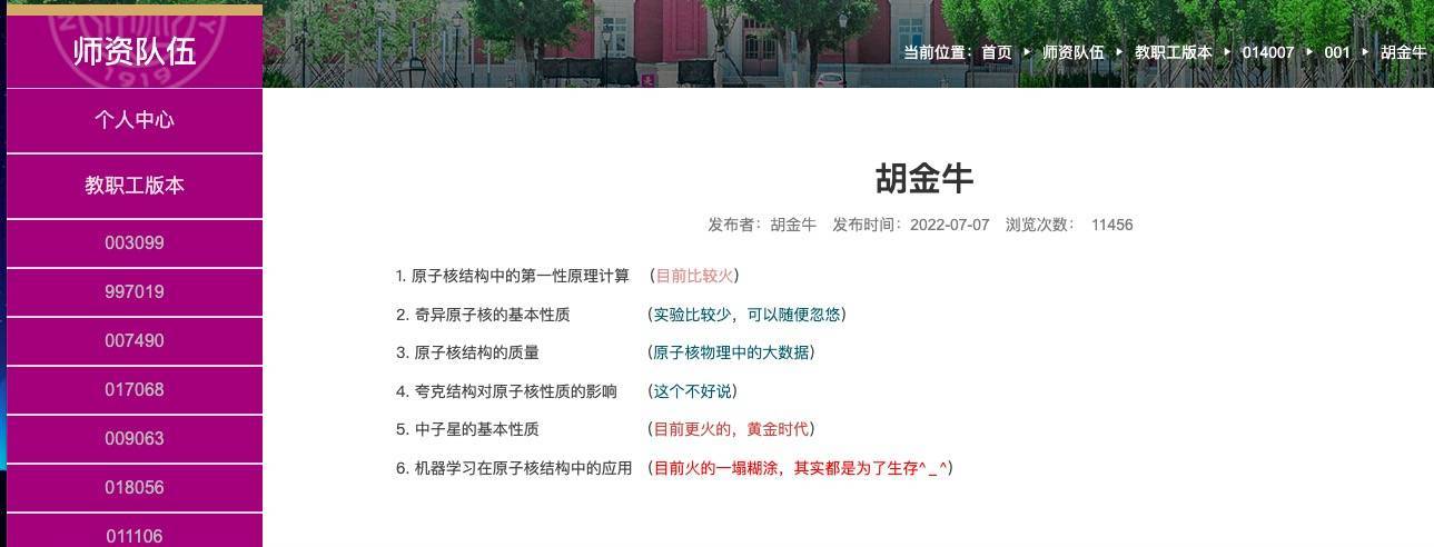 胡金牛教授还写道:“担任Chin. Phys. C, Int. J. Mod. Phys. E, Chin. Phys. Lett.等期刊审稿人(被人强拉进去的)。目前担任中国核物理学会理事(承蒙各位前辈大佬的支持)。研究方向为原子核结构理论,主要包括利用真实核力从第一性原理出发研究原子核的基本性质;三体核力在原子核结构中的作用;格点QCD理论在核物理中的应用;中子星的基本性质以及奇异原子核性质。”