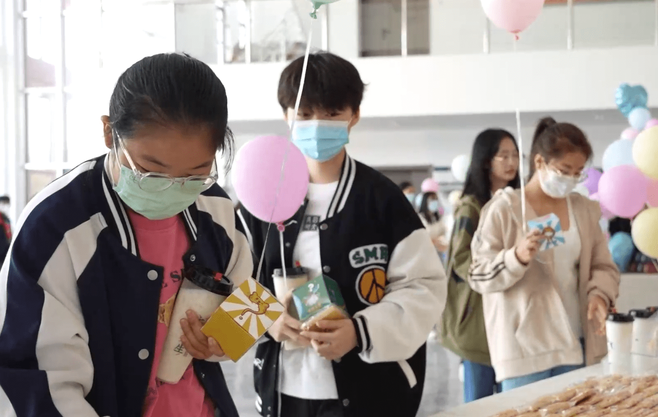 大二学生们身着白衣,带着口罩、手套、头套,使用量杯等仪器,精心制作奶茶。新生们则排着队领取包括奶茶、口罩、气球、饼干在内的各种礼品,脸上洋溢着微笑。