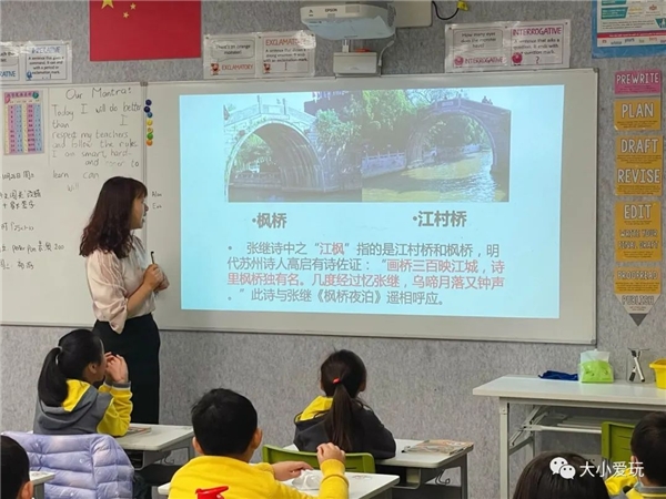 三年级的唱诵古诗时间,老师带着孩子们诵读、鉴赏《枫桥夜泊》。