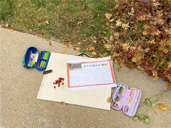 把落叶两片、两片分成一组、红果儿四个、四个分成一堆儿…抽象的数学概念就这样无比具体了起来。学生一边在大自然中寻找数学,一边完成老师的作业单,小组协作效率挺高。