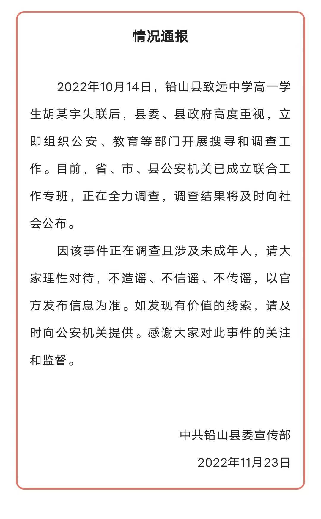 11月23日,江西铅山县委宣传部就高一学生胡某宇失联一事发布情况通报。通报称,目前,省、市、县公安机关已成立联合工作专班,正在全力调查,调查结果将及时向社会公布。
