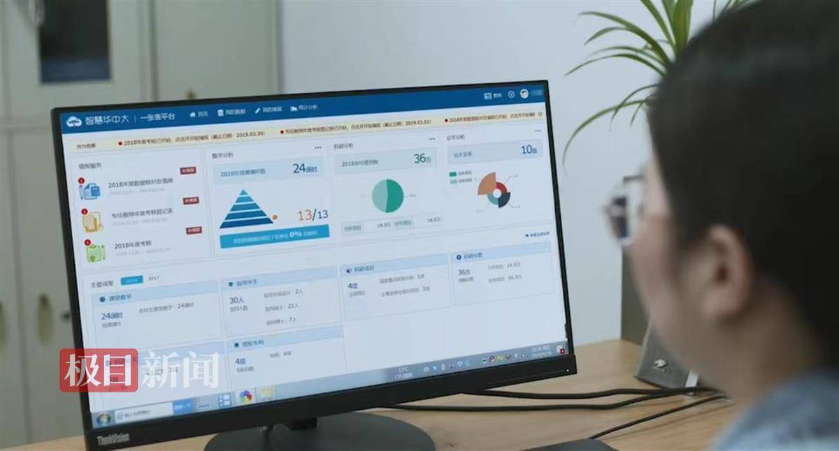 该中心工作人员在电脑上用教师账号登录“智慧华中大”,进入“一张表”平台。平台上老师的课堂教学、实践教学、指导学生、科研项目、科研经费、科研论文、科研成果等数据一目了然。不仅如此,所有数据均可视化分析,如老师可根据图表清晰看到自己某一项内容今年与往年情况的对比、与其他老师的数据对比。平台上,学院更能查阅到全面清晰的数据总览,教学、科研、人事等重要内容进行了数据分析和可视化呈现。“各个教授的科研情况,全学院总的科研项目、授权专利、科研著作等信息都一目了然,十分清晰,这对我们开展相关工作帮助很大。”华科大机械科学与工程学院副院长张芬说道。